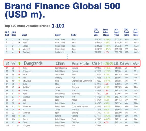 近日,全球知名品牌价值评估机构Brand Finance发布“2019年全球最具价值品牌500强”报告。中国品牌表现强劲,上榜品牌达77家,品牌总价值首次突破1万亿美元,其中恒大集团排名大幅跃升,位列榜单81位,成为中国品牌20强。