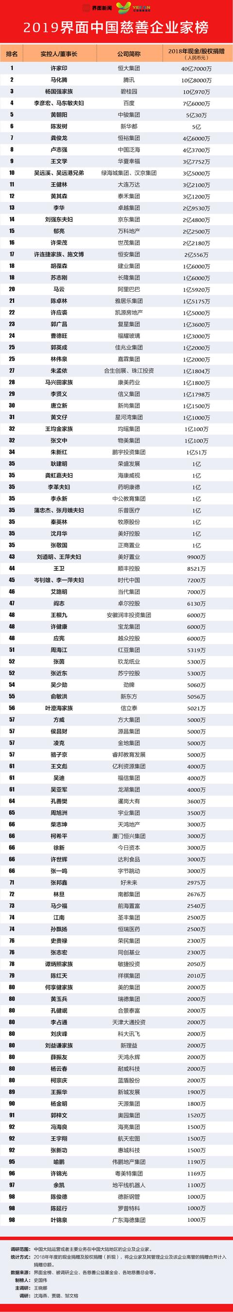 4月16日,2019中国慈善企业家榜发布,许家印、马化腾、杨国强家族、李彦宏/马东敏夫妇、黄朝阳、陈发树、龚俊龙、卢志强、王文学、吴远溪/吴远港兄弟位列榜单前十。