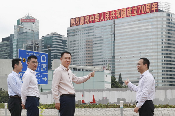 许家印检查恒大香港总部大楼五星红旗飘扬的展示效果