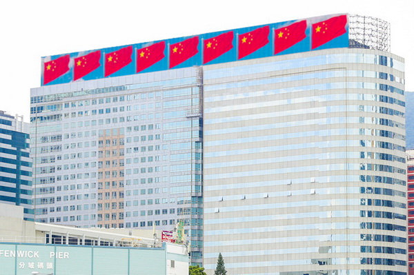 恒大香港总部大楼位于港岛核心区域,其顶楼的LED屏高10米、长110米,是香港最大、最长的巨幅LED屏。早在8月开始,恒大利用总部大楼LED屏,展示出一排五星红旗在维港上空迎风飘扬。今天开始,五星红旗与庆祝国庆标语交替出现,成为维港天际线最绚丽夺目的一道风景。
