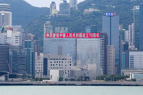 恒大香港总部大楼打出国庆庆祝标语